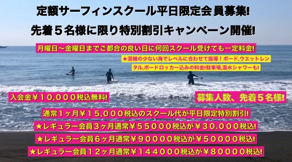 好評の定額サーフィンスクール平日限定会員、入会割引キャンペーン開催!
