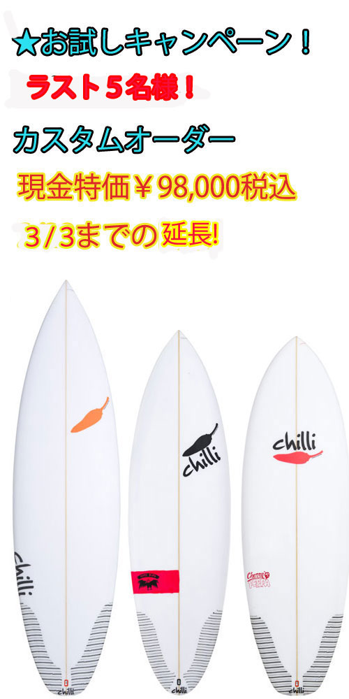 チリサーフボードお試しキャンペーン3/2まで延長ラスト5本!