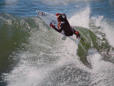 ドライブの効いた、深いボトムターンの添田博道さん。使用ボードは、FIRE WIRE,JAPANモデルの、6.0x185/16x25/16