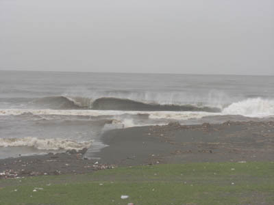 強い南風でジャンクだった花水、夕方、風がオフシュアに変り、何とかサーフできるようになりました。セットは、頭オーバーから頭半位、河口インサイド掘れてました。