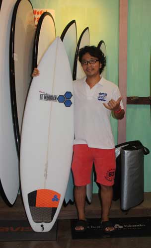 ★アルメリックの試乗用ボードを、ちょっと貸してと乗ったら、調子良く、断然、気に入ってしまった、ベテラン、良い波食い、アイランド、トリップ大好きMさん! 選んだのは、最新ウルトラモダンショートボード、DFRをいち早くゲット!