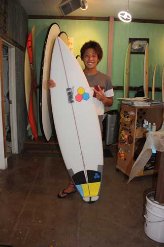 ★花水ローカル、中堅、若頭のダイスケ、サーフィン歴20年くらいで、プロがいるセッションの良い波の時でも、かならず、セットの良い波をゲットする!夜勤明けで寝てなくても、3,4時間サーフするタフな奴!今回作ったボードは、NEWS高橋に相談して、カスタムオーダーした自分だけスペシャルモデル!