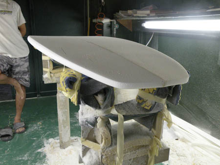 本日、SSJファクトリーに修理のボードを置きにいき、ふと、シェーパー高橋の部屋をのぞいて見ると、ラウンドノーズの短いボードをシェープしていた。もしやと思い近くまで入って見ると私の名前が書いてあり、高橋がやっとできましたよ!そうです。まぎれも無く私が、前から高橋に頼んでいたスペシャルなミニボードがついに誕生!名前は、PENTAGONグラシッングが終わって早く乗れる日がまちどうしいです。