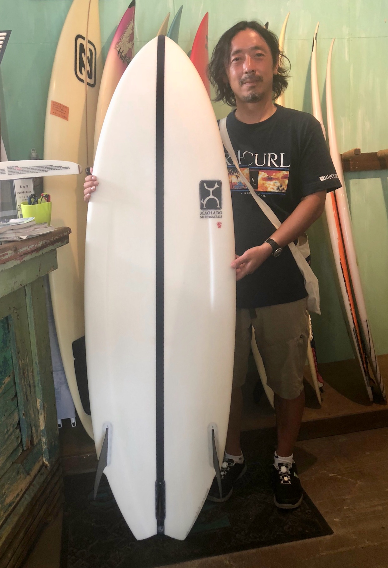 ★当店サーフィンスクールのインストラクターも手伝ってくれてるベテランローカルサーファーのHAYA君はロブマチャドデザインMAIDS LFTをニューボードにお買い上げいただきました!
