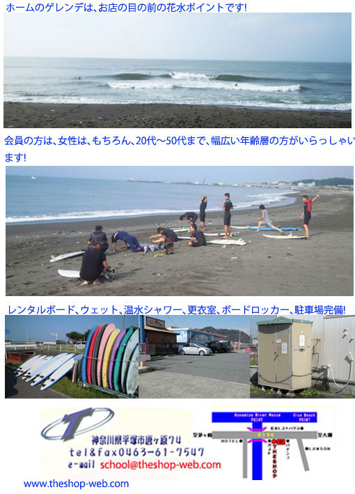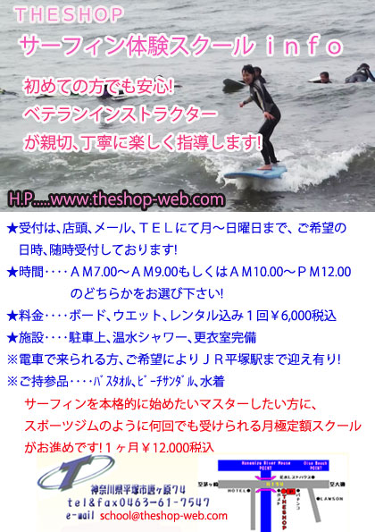 これからサーフィン始めようとお考えの方、又始めているが一人では中々乗れるようにならないとお悩みの方、どうぞ当店、定額スクールに是非!