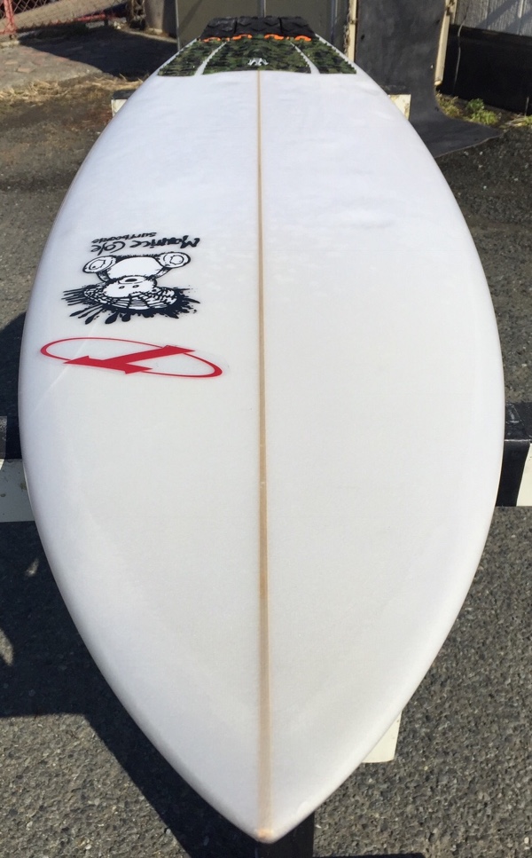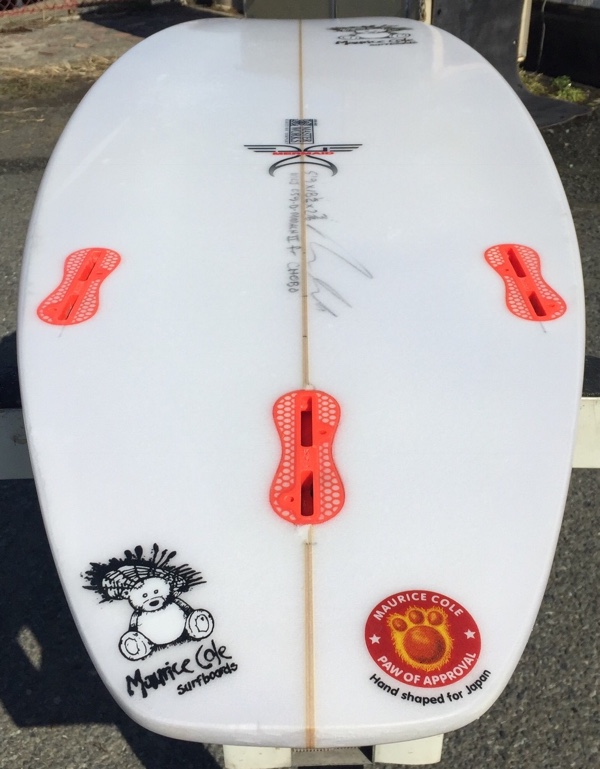 モーリスコール、オールラウンドショートボードの中で一番人気、乗りやすいモデル! 膝からオーバーヘッドまで波を選ばず使える。 見かけよりテイクオフが早くパドルイージー シニアサーファーにもにも人気、オーナー三堀もお気に入りの1本! ※程度はデッキにフットマーク凹み有りテールレールに分からない程度のリペア1ヶ所(写真参考)ありますがその他問題無くまだまだ全然使えます!2015来日シェープボード!