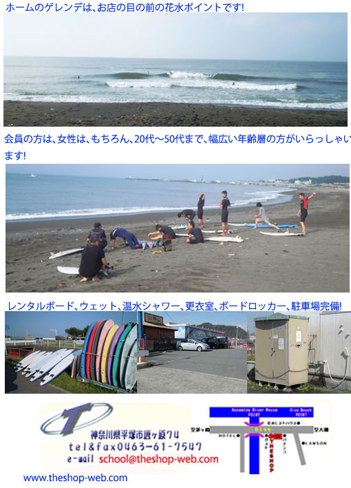 当店定額スクールは年中無休、これから始める方は、もちろんのことですが、特にロング、ファンボードからショートボードやって見たい方には、是非、お進めスクールです。