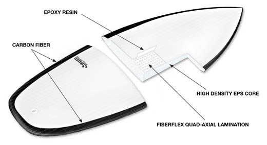 軽量かつ丈夫、(壊れにくく、凹みにくい)そして、反発力抜群で定評のあるファイバーフレックスが新開発のQUADAXIEL使用により、更に、ターンの時の不必要な、ねじれを抑えられることに成功し、ターンの時、サーフボードに加えた力を逃がすことなく今まで以上に、フレックス性が良くなり、スピードが、だしやすくなった。