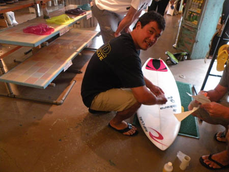 そして日本の波でテストする為持ってきた、秘密モデルにロックダンスステッカーを貼るウェード!