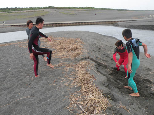まずは、ストレッチ、準備体操の後、陸上で、フォーム、体重移動のイメージトレーニング!イメージを体、頭にたたきこみます。皆さん、汗だくでした。