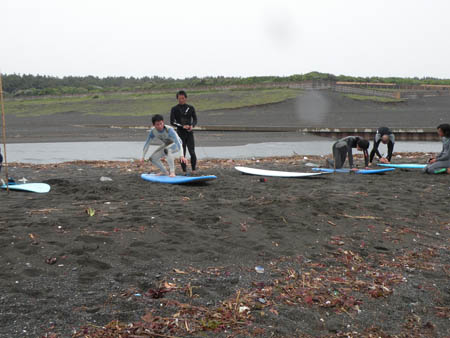 ますは準備体操、そして陸上でのパドリングの仕方、ボードに乗る位置、スタンスの位置、テイクオフフォームの練習!