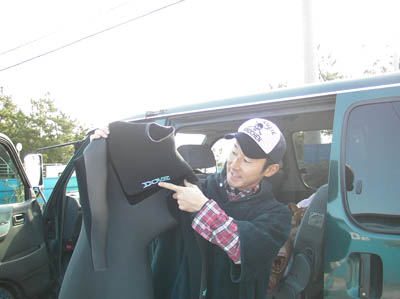 早速、駐車場に止め、ウェットに着替える!、今回のメンバーの中で、唯一、サーフ歴4年のI君は、初おろしのニューピン、フルスーツ!