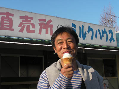そして、サーフした後、かならず、食べたくなるスウィートな物、鴨川有料道路を降りた、美味しいアイス屋さんで、食後のデザート、生乳ソフトクリームを、千葉初めて、最年長、Nさんも、思わず、笑みがこぼれてます。