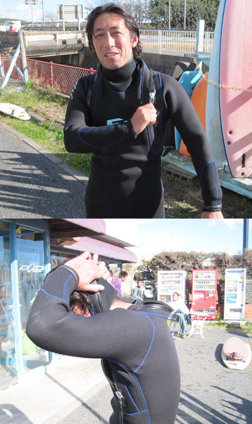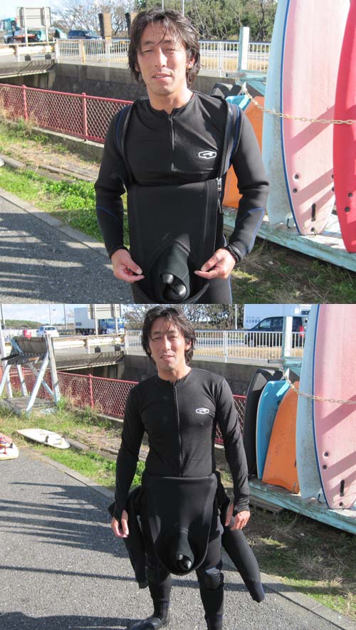 中に着ているのは全身インナースーツ(¥15,540)←これ僕(kenji)も持ってますが超暖かいです!千葉南までいって`雪´が降る超寒い中セミドライ忘れてこのインナーをDOVEの人に貸してもらいジャーフル+全身インナーでやって平気でした!本当です。話はそれましたが、このインナー