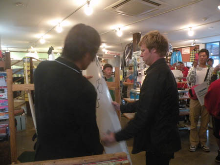 このボードは、ひじょうに、丈夫で壊れにくく、ターンした時の反発力、伸び、トップでのボードの返りとも抜群、最高のボード!、しかも、タジが来店、した時のサイン入り、超レアです。体重63kgまでの方にお進め!本当は、あんまり売りたくないのが本音です。金額¥99750税込み