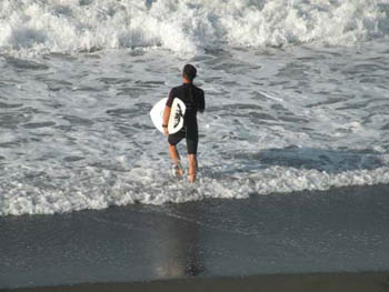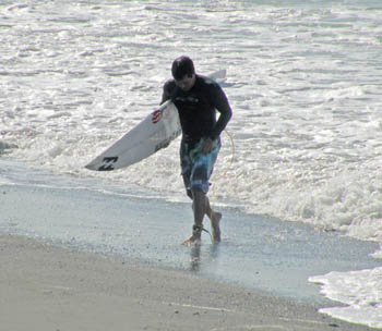 脇田プロニューボードを持ってさっそうと海ヘ向かいます。波は、やはりたまのセットでもも前後!