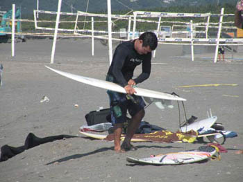 ウェードは、中村昭太プロ用にシェープしたボードを2本持ってきました。どちらもまだ、市販されてないニューモデルで、自ら、テストするようです。