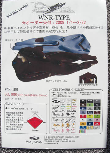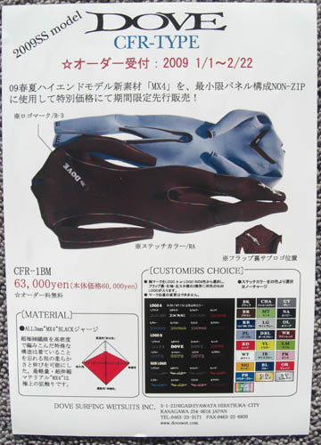 今年3月に発売予定のDOVE,WAVEATTACK,の新素材、MX-4,去年MX-3を作られた方は、いかに、柔らかいか、分かっていらっしゃると思うが、今年は、更に、進化し、保温性、軽量性、耐久性、運動性ともパワーアップ!しかし、MX-3,4を使うと値段が高くなり、去年でMXー3使用で税込み¥89250これじゃ中々手がだせない。今年も3月デビューのカタログからは、同じ位の値段になってしまうのですが、今回のスペシャルオーダーフェアーは、何と...オール。3mmジャージで、全身MX-4使用、そして、最小限パネル構成、つまり、パーツが少なく縫い目が少ない設計でNON,ZIP、これで、税込み¥63000です。去年のYMXモデルよりも安い、オーダーは、2/22まで、ジャーフル、作ろうと思っていらっしゃる方、絶対お買い得です。¥20000以上安くなってます。期間限定です。
