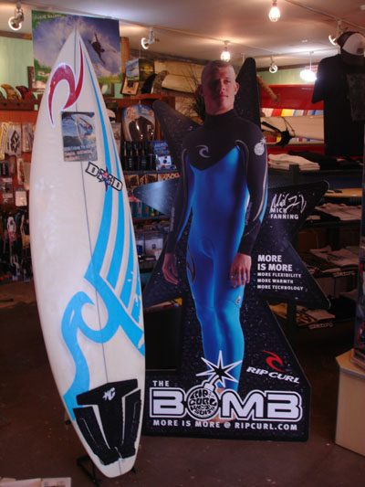 こちらは、当店にいるミックです。隣のボードは、去年、JBAY優勝した時のボードです。スペックは6.1x181/4x23/16です。